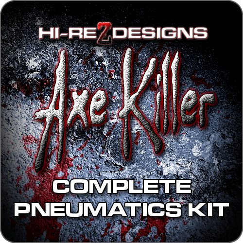 The Axe Killer Complete Pneumatics Kit is a complete pneumatics setup with all the air valves, cylinders, power supplies, brackets, fittings, mufflers, tubing, air pressure regulator, and connectors. The kit comes partially assembled for you (you connect the tubing between the components) and all you have to do is install the kit into your prop and add air pressure. You do not need any additional pneumatics parts.